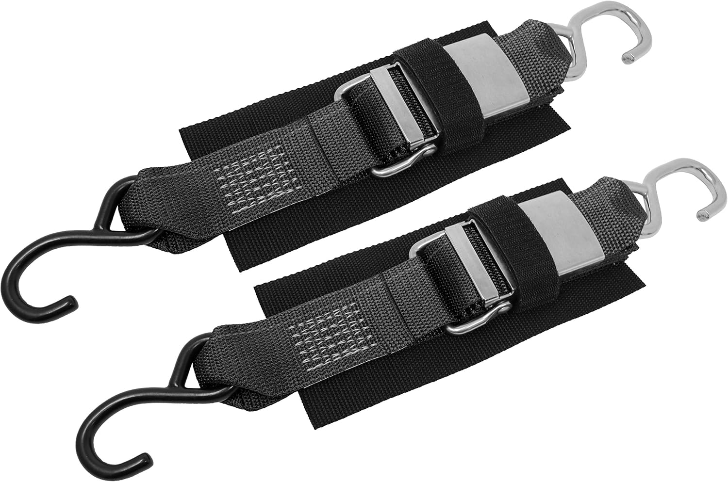 2 Pack, 2 Inch Quick Release Tie-Down, Protective Pad With Hook And Loop Security Strap Sewn Under Buckle, Stainless Steel Quick Release Buckle With 304 Grade Stainless, Vinyl Coated S Hook On Fixed End, Stainless Steel S Hook On End Of Adjustable Strap, Fixed End Strap 0.50 Ft (6 Inches), Adjustable Strap 4 Ft, Total Strap Length 4.5 Ft, Polyester Tie-down Webbing, Made In The USA